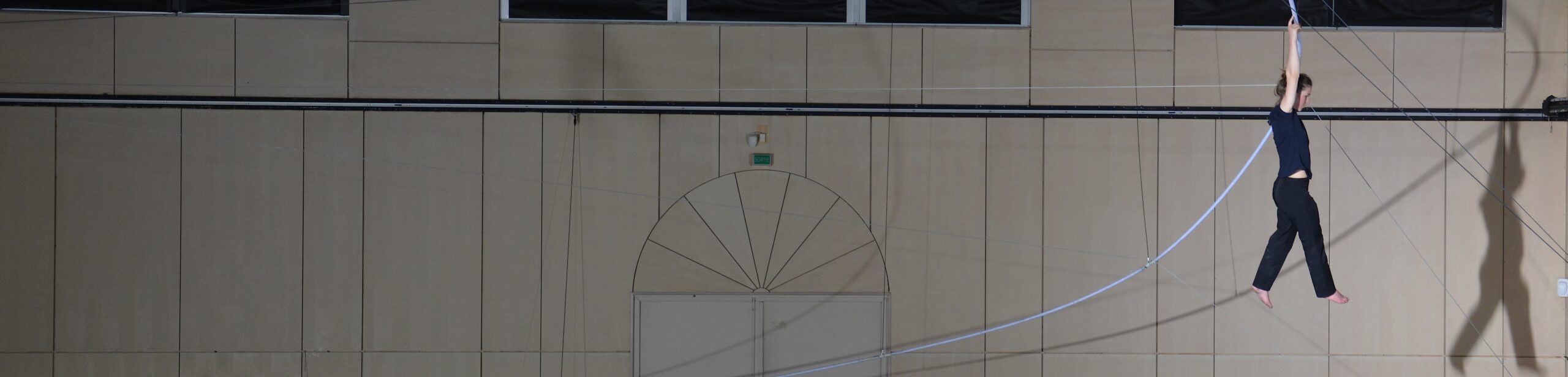 Trente à quarante mètres de fin cylindre d’acier traversent et reconfigurent l’espace. Différents tracés de lignes et de courbes, autant de territoires aériens, implacables, parcourus par soixante kilos de masse féminine vivante